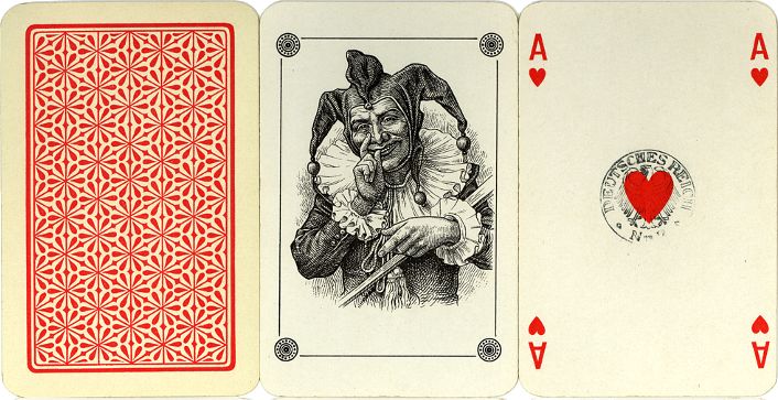 Right: the geometrical back design, the Joker and Ace of Hearts with 'Deutsches Reich' tax stamp which was in use in Germany from 1931 to 1936. Images courtesy Barney Townshend.