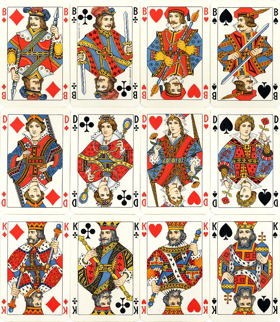 The designs are a meld between the standard international pattern and German-style French-suited cards. Elements from various other standard patterns can be detected.