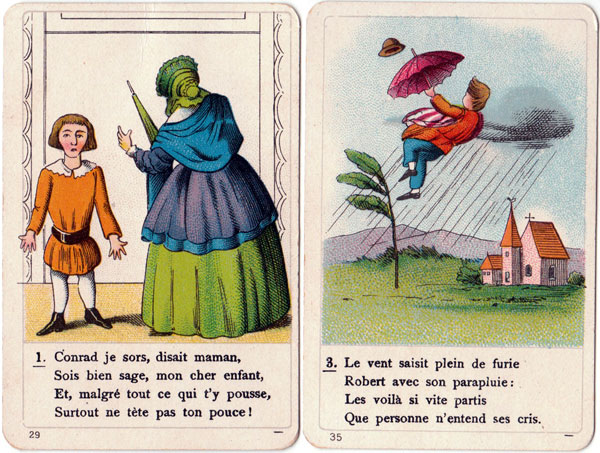 Above: the complete set contains 36 cards. The print quality and quality of the card and packaging are all excellent. According to the label on the box the game is authorized by the publisher as well as by the author, suggesting that it was first published before the death of Frankfurt psychiatrist and author Heinrich Hoffmann (1809-1894), who wrote the Struwwelpeter stories in 1847 for his son Carl. The Struwwelpeter stories quickly became famous in Germany and the success spread to other countries. The stories were translated into many languages→