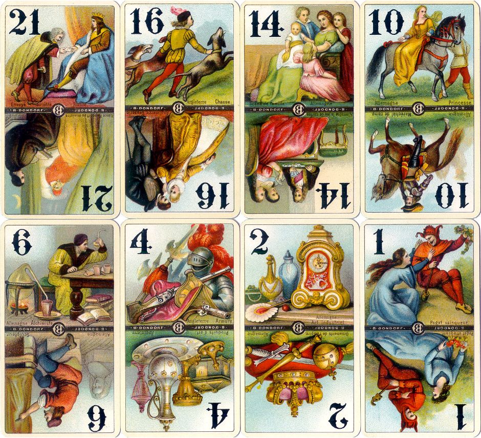 Above: eight trump cards from chromolithographic edition of Dondorf's “Microscopique Tarock“, rounded corners, c.1905-33. Below: the same cards reversed, showing the different scenes at each end. Images courtesy Barney Townshend.
