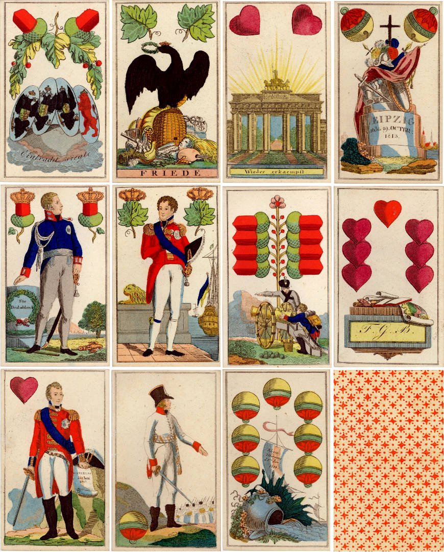 Victory deck commemorating the Liberation war by Friedrich Gotthelf Baumgärtner, Leipzig, 1815. Copper engraved, hand coloured by stencil, 36 cards. Baumgärtner was the owner of the Industrie Comptoir in Leipzig.