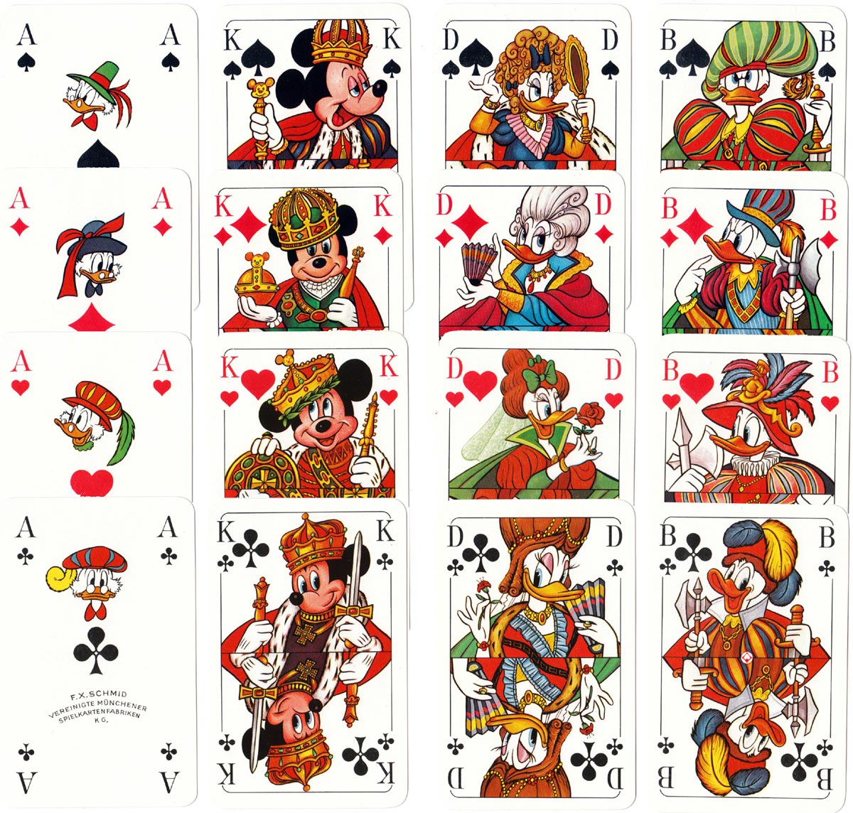 Micky Mau~Mau comic skat playing cards made by F. X. Schmid Vereinigte Münchener Spielkartenfabriken, 1978. Different Disney figures on the court cards (double-ended) with smaller cartoon motifs on each numeral card.