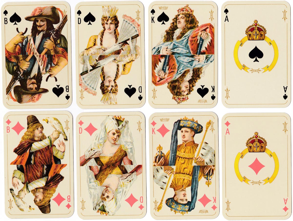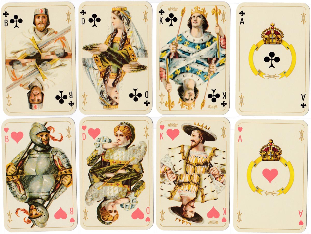 The courts depict historical figures: King of Hearts - Franz I. His Queen is a lovely woman dressed in a Renaissance style costume. Jack of Hearts – Landsknecht. The King of Clubs is Louis the Pious, Jack - Knight Templar. The King of Diamonds resembles the features of Charles VII. The Queen - His Beloved Agnes Sorel. King of Spades - Louis XIV (Sun King). Note: decks for the Royal household would have no tax stamps, but those printed for general sale do.