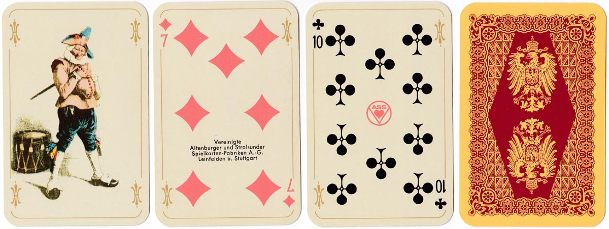 Above: facsimile of “Kaiserkarte” published by A.S.S., c.1970. The original cards did not have indices, featured a different back design and the four aces were more ornamental than in this reproduction. Contrary to the inscription on the reprint box that the original deck was first produced in 1910, the deck was first published in 1895-1897. Images courtesy Rex Pitts.