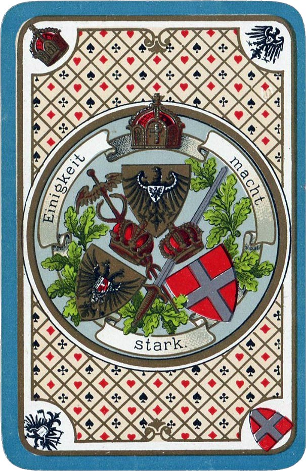 “Kaiserkarte” was published specially for the last German emperor and King of Prussia, Wilhelm II. The cards were printed at the Altenburg Card Factory (Altenburger Spielkarten Fabrik Schneider & Co) in 1895-1897. The back features a medallion surrounded by an oak wreath. In the centre are the coats of arms of Germany, Austria and Italy, with a crossed sword and caduceus. German motto: “Einigkeit macht stark” (Together we are stronger).