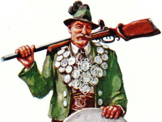 “Spielkarte für Schützen” deck designed and produced by Karl Heinz Lanz, artwork by Fritz Uhlich and published by Rudolf Bechtold and Co., Wiesbaden, c.1966. The same three court card figures are repeated in each suit, and the numeral cards are represented by shooting targets, either red or black.