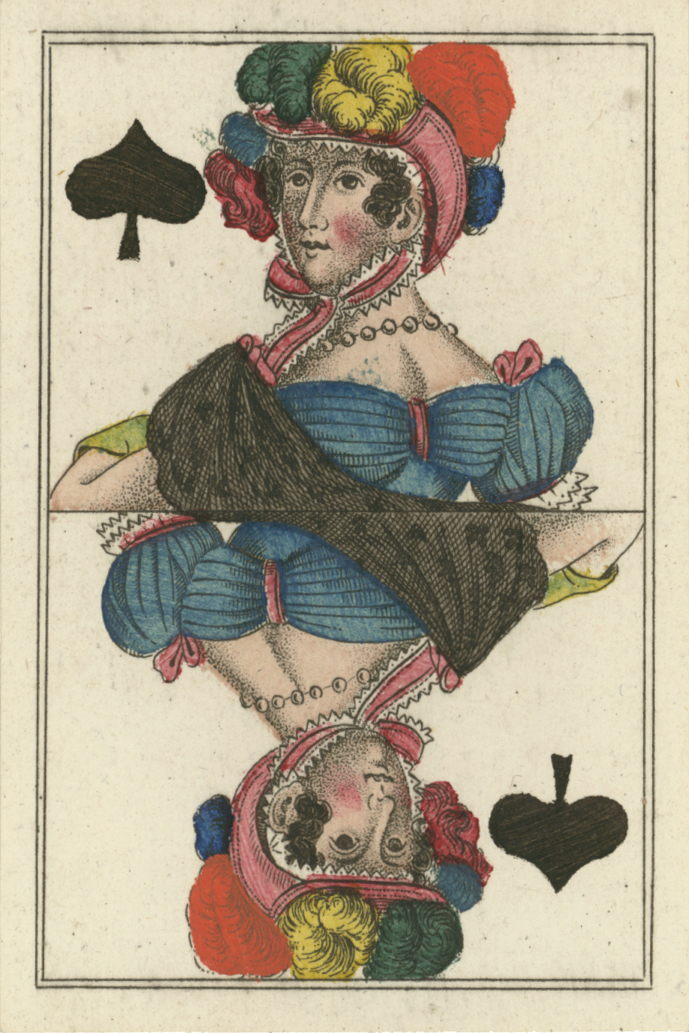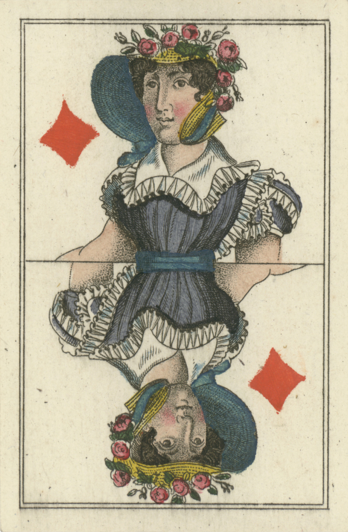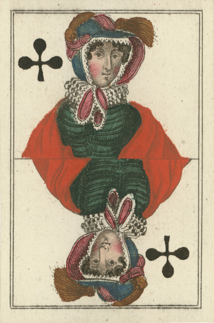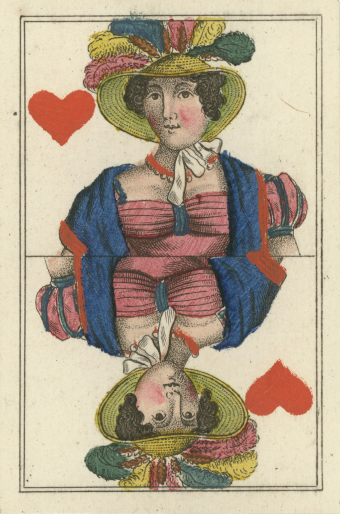 This very attractive engraved pack, albeit of a relatively simple design but with a great deal of intricate detail in the clothing and accoutrements, was made in Germany by an unknown maker c.1820-30 (possibly Bacher of Ulm). It is a fine example of the early cardmaker’s art and is hand-coloured using stencils with about 5 or 6 different colours. The double-ended courts are divided by a horizontal line and a double line serves as a border around each card. The ladies’ attire illustrates fashion from that period but they do not hold flowers or fans as is often the case. The aces are plain.