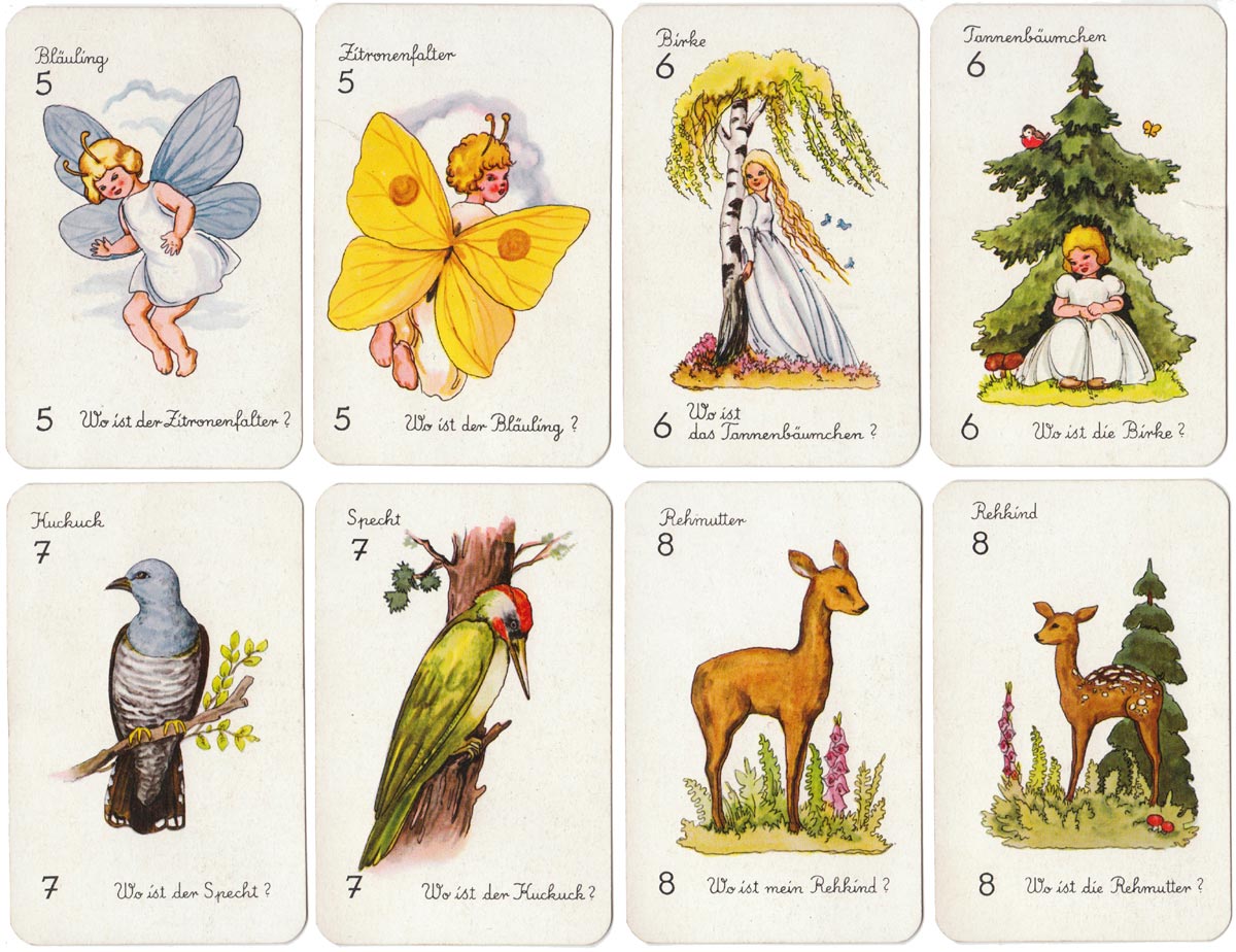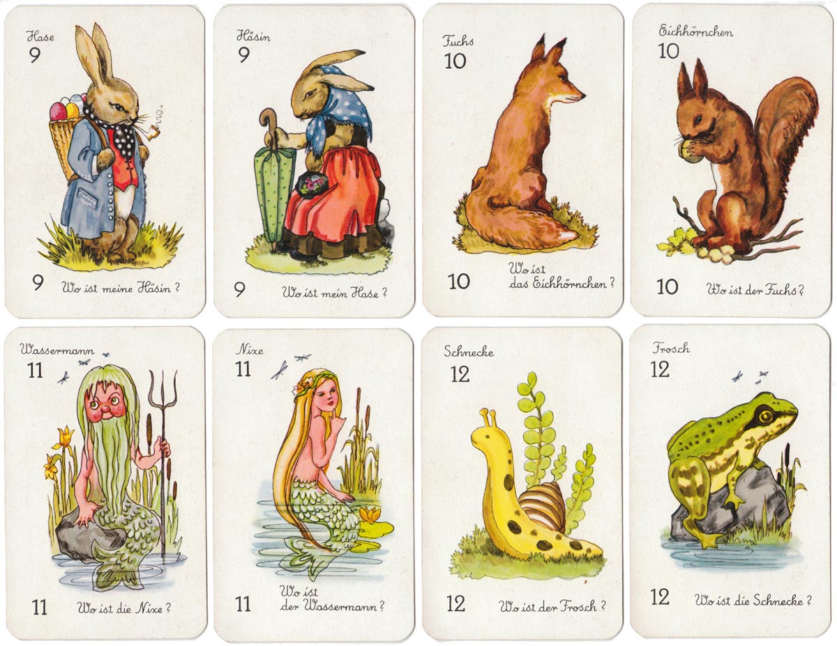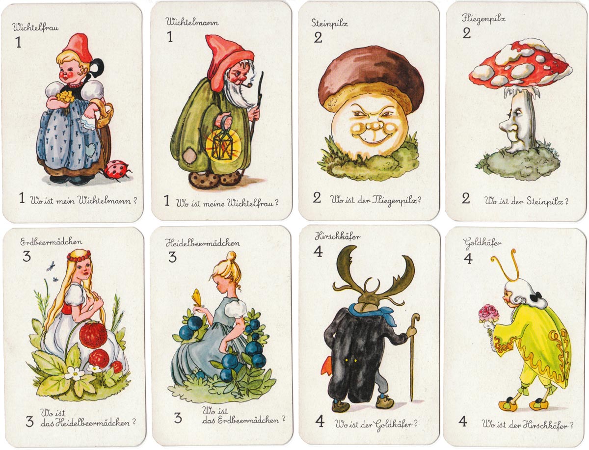 Above: “Schwarzer Peter Der Wald und seine Leute” card game illustrated by Liesel Lauterborn, manufactured by Vereinigte Altenburger und Stralsunder Spielkarten-Fabriken AG, 1955. 25 cards (12 pairs + Schwarzer Peter) + rules + extra card in illustrated box. Other editions are known (e.g.: Ariston Spielkartenfabrik GMBH Detmold).