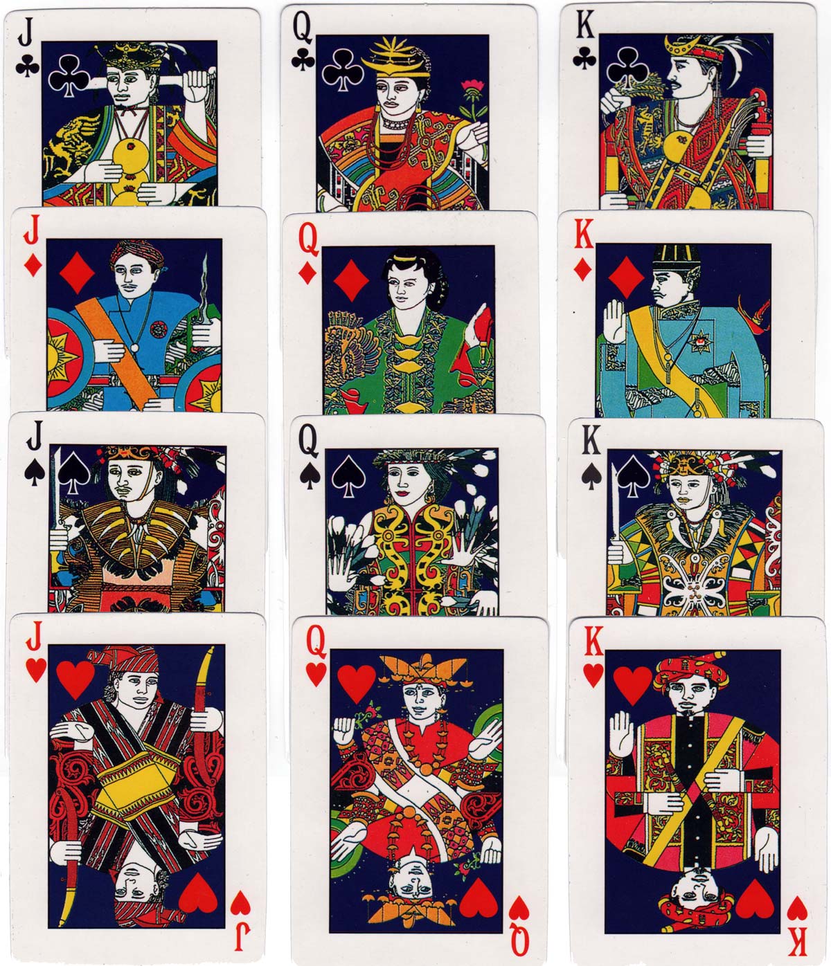 Souvenir playing cards from Garuda Indonesia Airlines, the national airline of Indonesia, named after the holy bird Garuda from the national emblem of Indonesia. The court cards appear to depict ethnic Indonesian characters. See the Box►