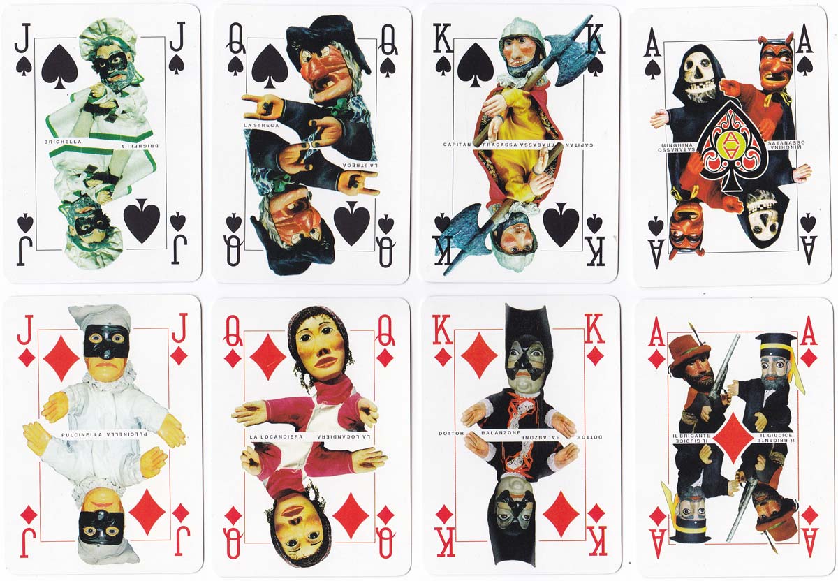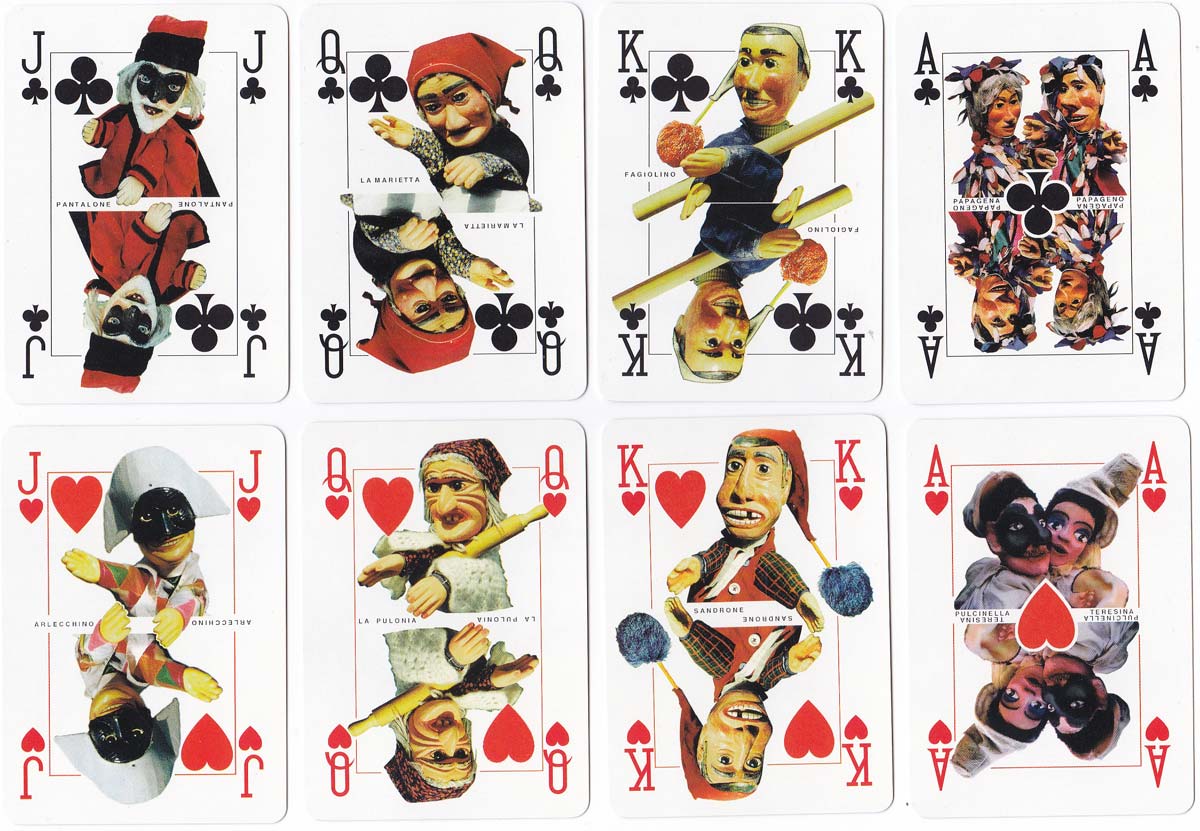 Above: Baracca & Burattini puppetry deck, sponsored by La Società del Sandrone, produced by Iperteam Software Services (Modena) and printed by Dal Negro, 1998. 52 cards + 2 Jokers + extra card in box, 2500 copies.