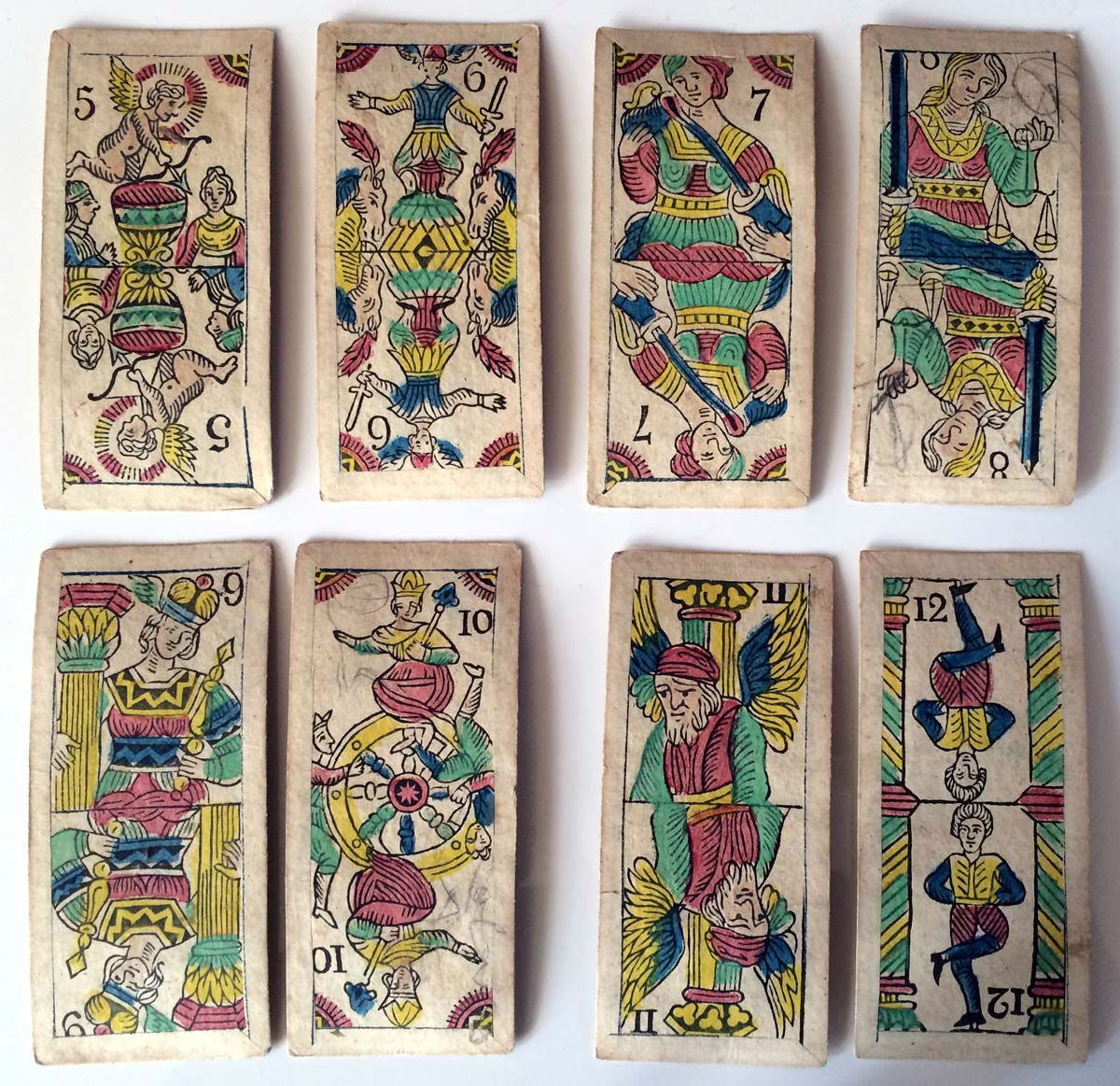 Above: Tarocchino Bolognesi printed from woodblocks and setencil-coloured by Carlo Zanardi, c.1850. All images courtesy of Maria Alessandra Umiltà.
