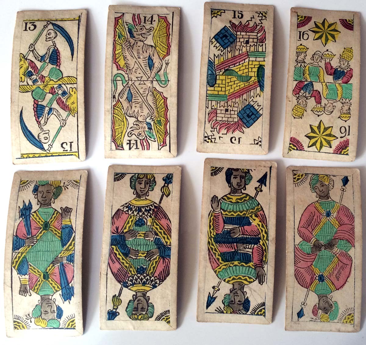 Tarocchino Bolognesi by Carlo Zanardi, Bologna, c.1850. Tarocchino is an early localised ancestor of Tarot with only 62 cards, omitting numeral cards 2-5, leaving 24 pip cards, 16 court cards and 22 trumps in a somewhat different sequence to other tarots. Another distinction is that in c.1725 the four imperial and religious trump cards were changed from the traditional ones into four Moors. Soon after this the deck was made double-ended and numbered with Arabic numberals. And in this example, instead of the ace of coins there is an empty card with two tax stamps►