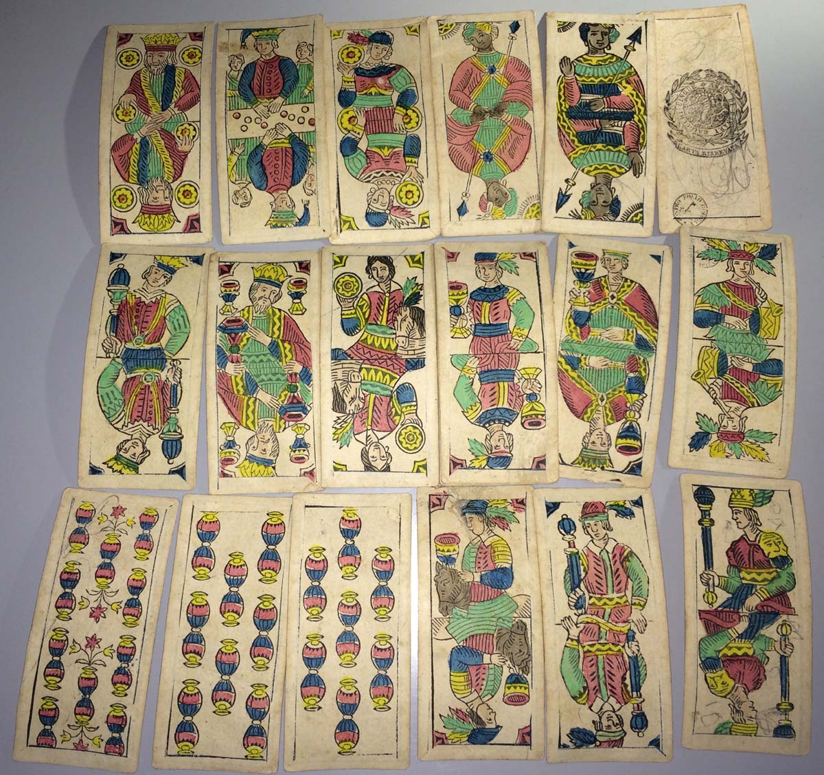 Above: incomplete deck by Carlo Zanardi with similar stamps on the ace of coins, c.1850. The colour palette is also similar. Courtesy Alberto Pérez González.