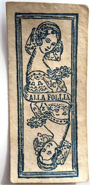 The double-ended back design, printed in blue, shows a young woman with the legend “Alla Follia” and the initials C and Z, from where we identify the maker of the deck.