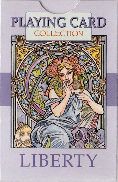 Liberty playing cards with gentle ‘Art Nouveau’ illustrations by Antonella Castelli, a miniature work of art, published by Lo Scarabeo, 2003. Lo Scarabeo certainly know how to present a pack of cards. It’s wonderful to have all the pack described and dated in several languages on the extra cards►.