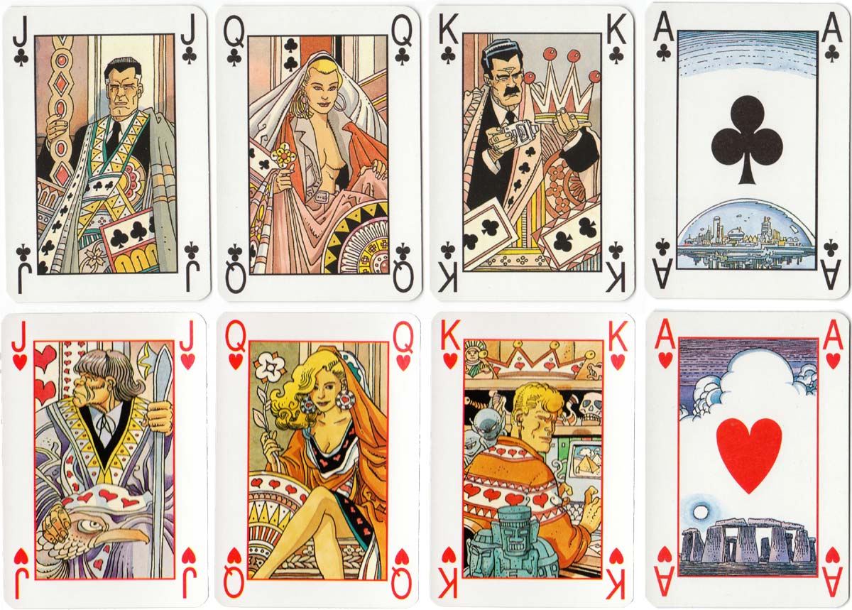 Martin Mystère is usually accompanied by Java, a Neanderthal man from Mongolia who is shown on the jack of spades. Further characters from the stories are depicted on the other court cards. The numeral cards and back design have vignettes alluding to the timeless mysteries which the protagonist encounters. The leaflet explains some conjuring tricks involving illusionism and telepathy so that the pack can also be used to impress your friends. See the leaflet►