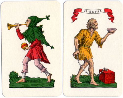 Above: the Fool is the highest ranking trump and serves to excuse the player from following suit. Miseria is the lowest trump, with no point-value, and ranking below trump 1.