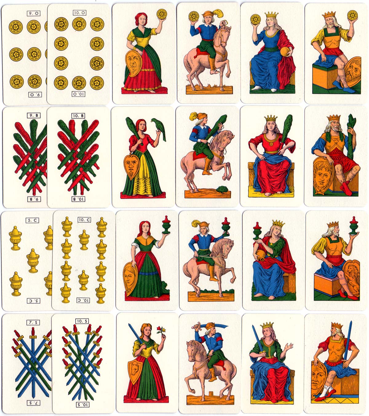 The cards are of a relatively small size compared to other tarocchi sets. The suits are of the Portuguese type, and the court cards are based on the Archaic South Italian or Portuguese pattern with Maids (Donne) as the lowest court figures of all suits, and intersecting batons and swords on the numeral cards. No aces are used in the game.