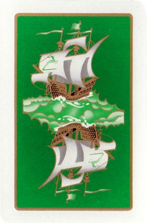 These fanciful designs in Art Nouveau style with oriental flavour were originally created as part of a tarock deck by Argio Orell (1884-1942) as a commission from the Austrian-Lloyd Steamship Line. They were first produced in chromolithography by S. D. Modiano in Trieste, Italy, in c.1910. The cut down 52-card version shown here with large indices and titled ‘World Bridge’ has been published by Modiano since around 1950. The tax stamp on the Ace of Diamonds on this copy is dated 1953. The Queen of Spades holds a cigarette, perhaps because Modiano also manufactured cigarette paper.
