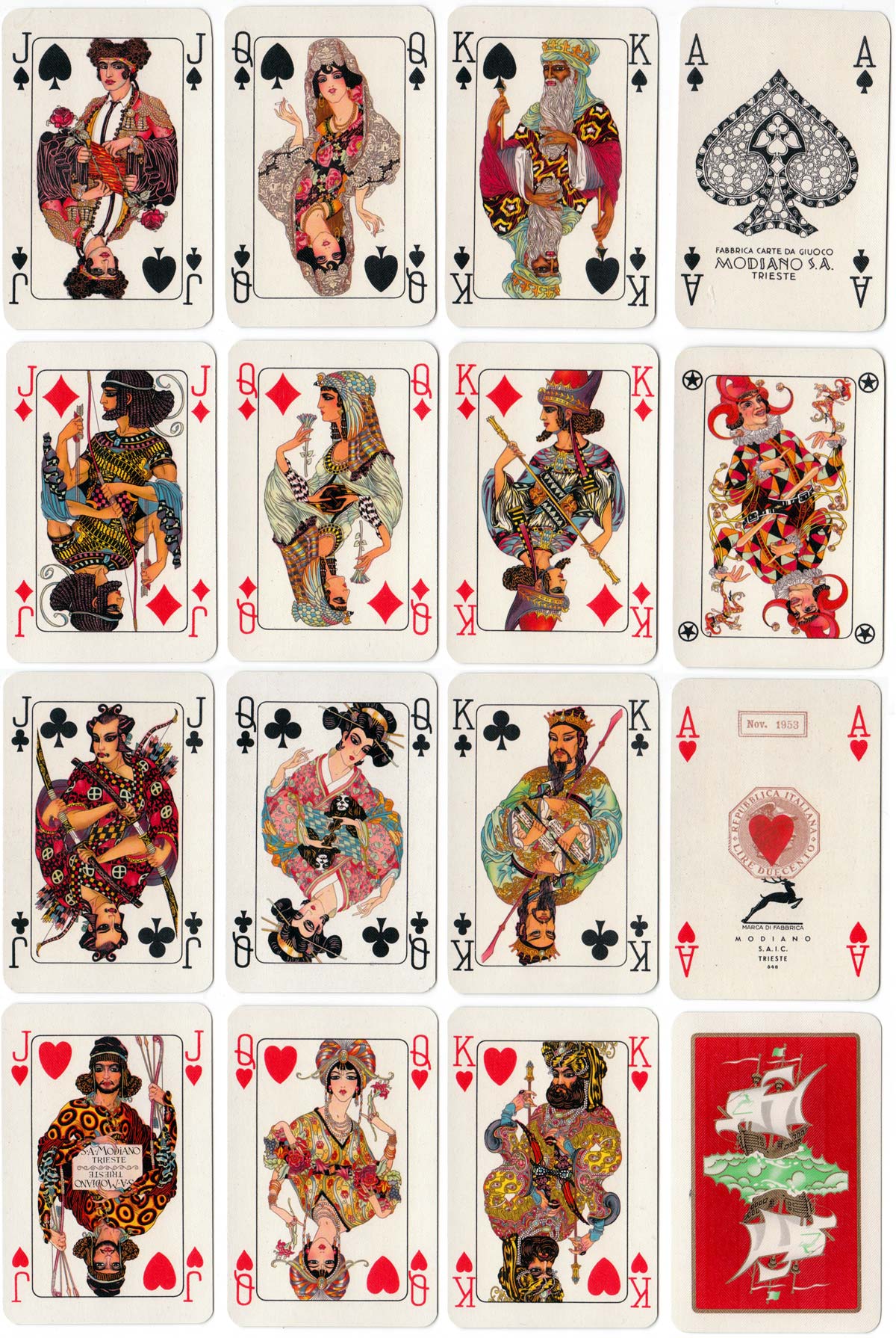 Above: ‘World Bridge’ by Modiano, c.1953. This 52-card deck was originally designed as a tarock deck by Italian artist Argio Orell (1884-1942) as a complimetary deck for passengers of a cruise ship line in 1910. The court cards feature people in richly detailed costumes in the exotic taste of the time in which it was created, representative of four cultures: the Orient for Clubs, Spanish for Spades (with a moorish king), Arabian for Hearts and Egyptian for Diamonds. Persia, India and the entire Asian region to far-eastern Japan are represented as part of Austrian-Lloyd Steamship Line's passenger itinerary. The tarock deck was re-printed in 1981. Images courtesy Rex Pitts.