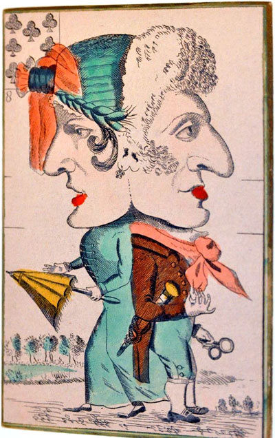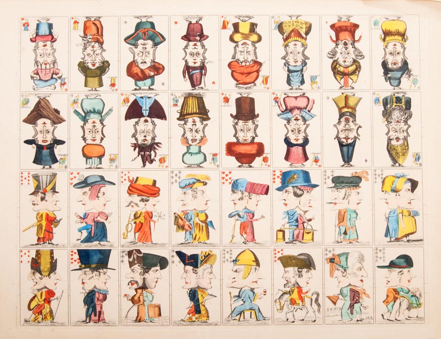 Jeu Grotesque was first published in France c.1800 featuring satirical and comic caricatures with enormous heads designed to excite laughter as well as for playing card games. Each card has a miniature playing card in the upper left-hand corner. The 12 court cards are actually double-ended with a different picture each way, whilst the numeral cards (A, 7, 8, 9 and 10) are caricatures of Janus figures. The original cards each measure 10.8 x 6.8 cm.