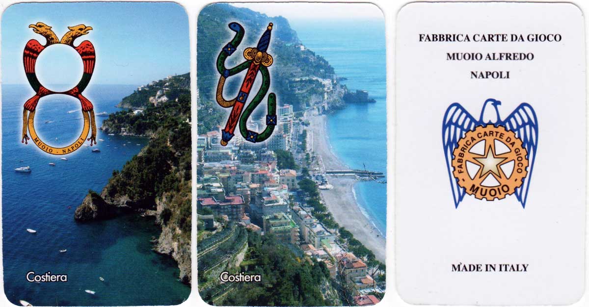 Above: Souvenir of Sorrento by Carte Da Gioco Muoio, Naples, c.2010. 40 cards + extra card in box, with rules for the games of Briscola, Scopa and Rubamazzetto. Neapolitan cards are among the most popular regional cards in Italy, being used in most of the Mezzogiorno.