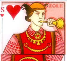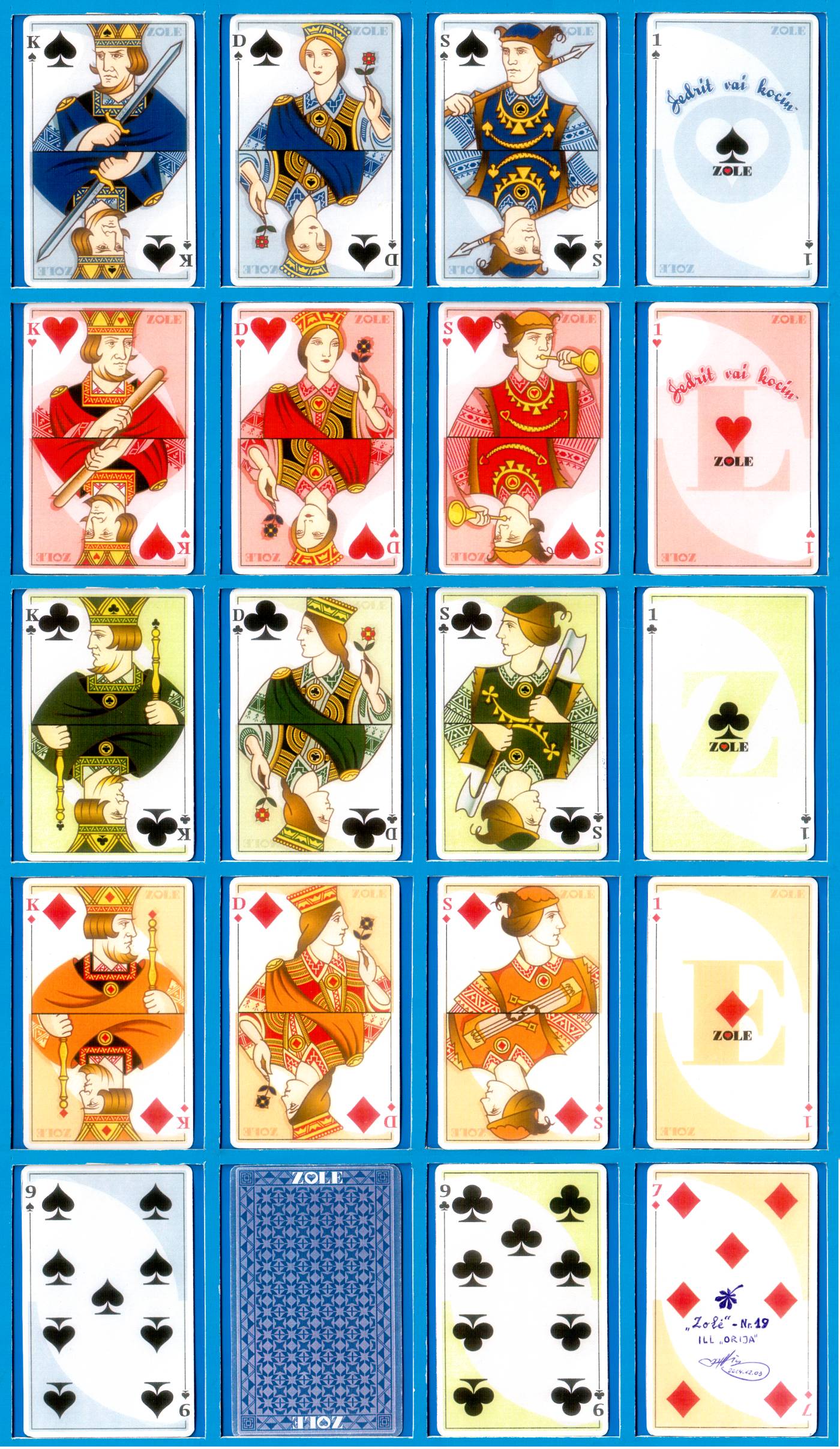 The playing cards originally designed by Alfreds Scwedrevitz in 1936 were chosen to be reissued as an advertising pack for Zole Vodka, produced by Latvijas Vīni (Latvian Wines) in 2000. However, the project was abandoned at the last minute and the cards were never issued.