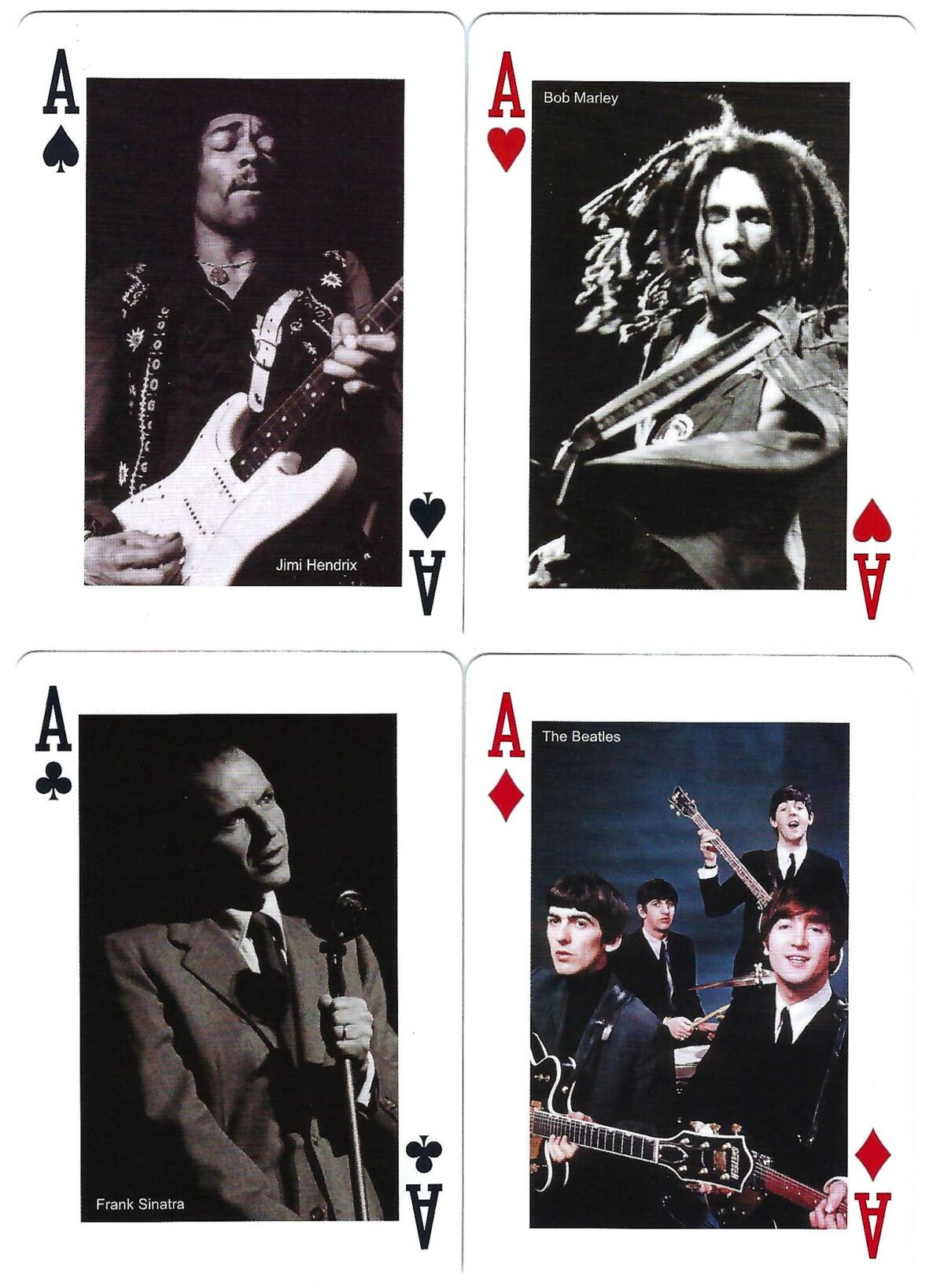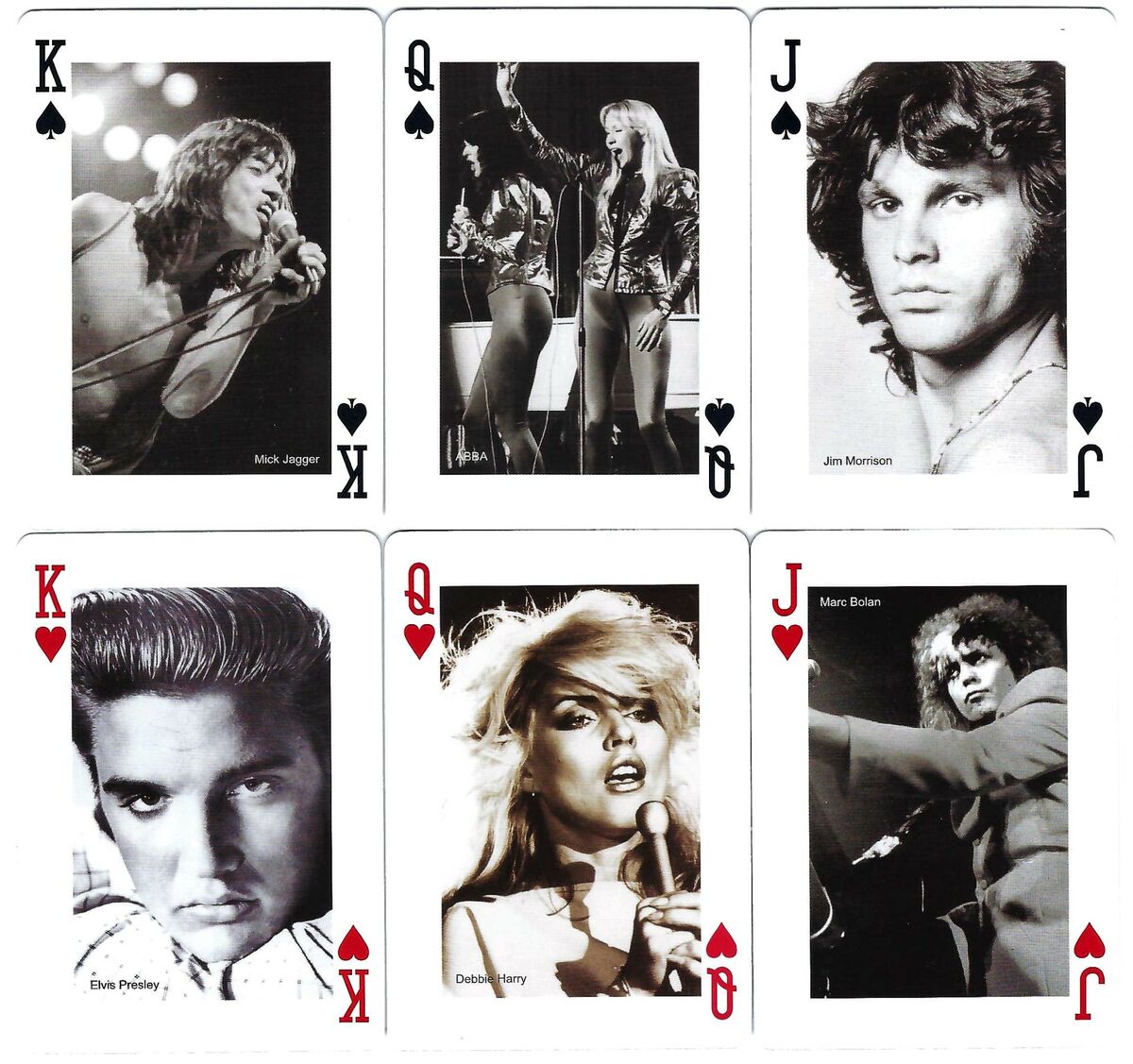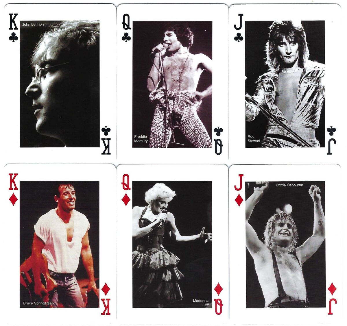 Above: Rock & Pop Legends playing cards, each card showing photographs of iconic performers in action.