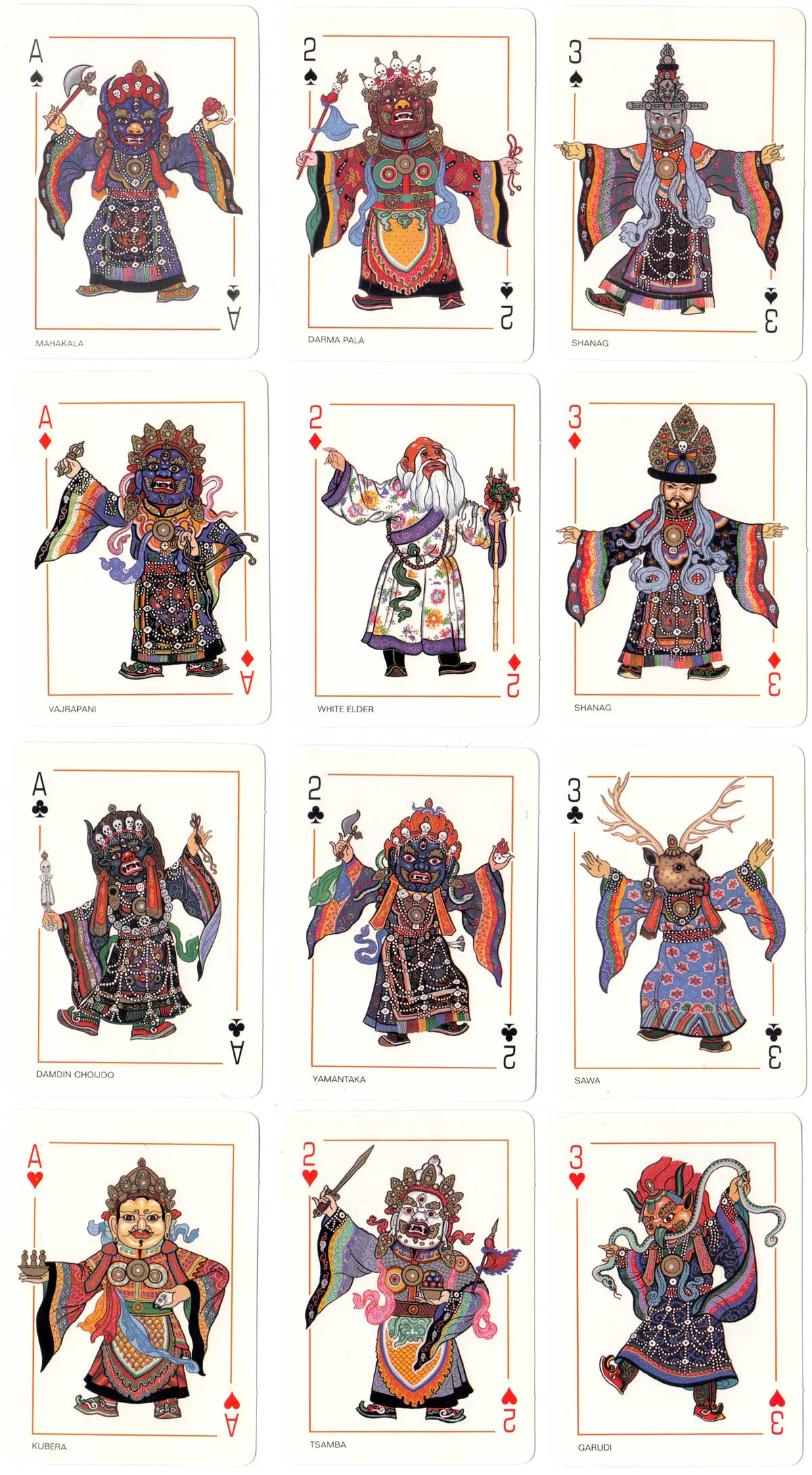 Mongolian Religious Mask Dancing playing cards, c.2010, printed by Tul Co Ltd of Ulaanbaatar Mongolia but published by Sherson Publishing House Pte Ltd of Singapore. The art of Mongolian Mask Dancing is called "Tsam" and is one of the significant religious rituals reflecting buddhist teaching. It is a theatrical art performed by skilled dancers bearing the external appearance and characters of different apostles and devils, animals or real people whose names can be read at the bottom of each card. See the Box►