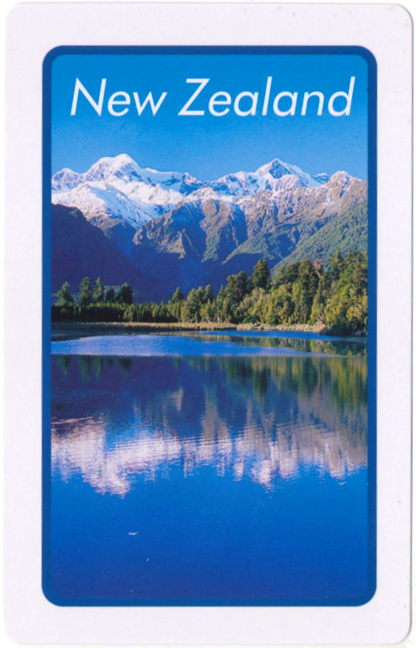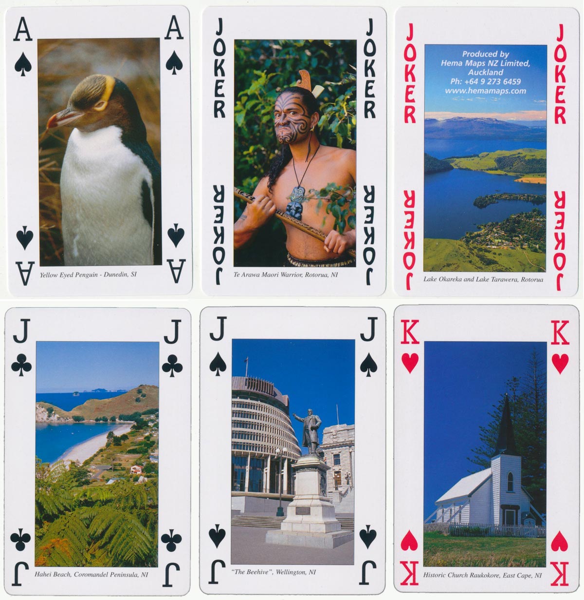 Above: Souvenir of New Zealand playing cards produced by Hema Maps NZ Limited, c.2002. 52 cards + 2 jokers in clear plastic box. Images courtesy Matt Probert.