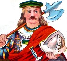 Above: cards from Whist No.32 made in Portugal by J. J. Nunes, c.1930s. These designs imitating late medieval costume, including the weapons held by the four Jacks, were originally published by B. Dondorf as 'Mittelalter No.150' and in the original cards the name 'B. Dondorf' can be read on the Jack of Clubs' helmet. In this edition no manufacturer's name is visible apart from on the two red Fours and box and the back design is a simple geometric pattern. Image courtesy Sally McBurney.