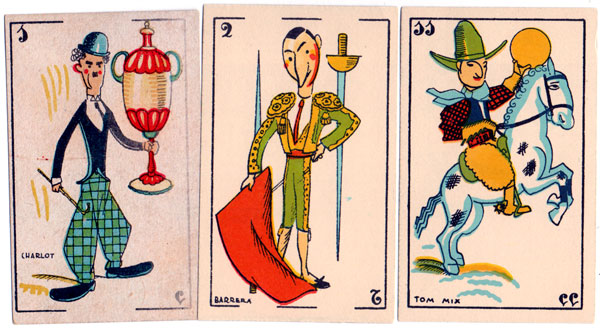 This cinema-themed pack from Spain captures the flavour of the era with artwork in an art-deco style. The card faces feature film personalities and also other contemporary champions from the worlds of sport and aviation on the court cards and in amongst the number pips. The backs, however, contain forty-eight numbered frames depicting Periquito (Felix the Cat) which make an animated ‘flick-book’ or elementary moving picture and link the pack to cinematographic history.
