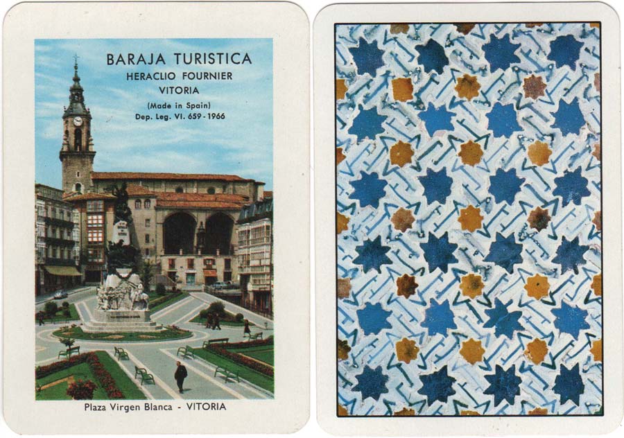 Above: Baraja Turística de España published by Heraclio Fournier, 1st edition, 1966. 52 cards + 2 jokers + extra card in box. Gilded corners. The four of clubs (Leon cathedral) has a green tax stamp.