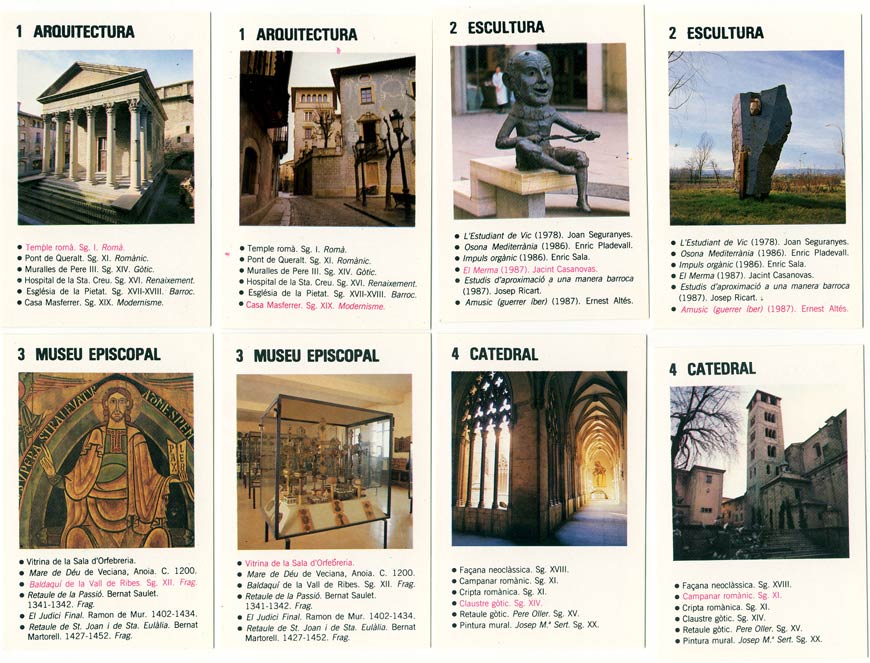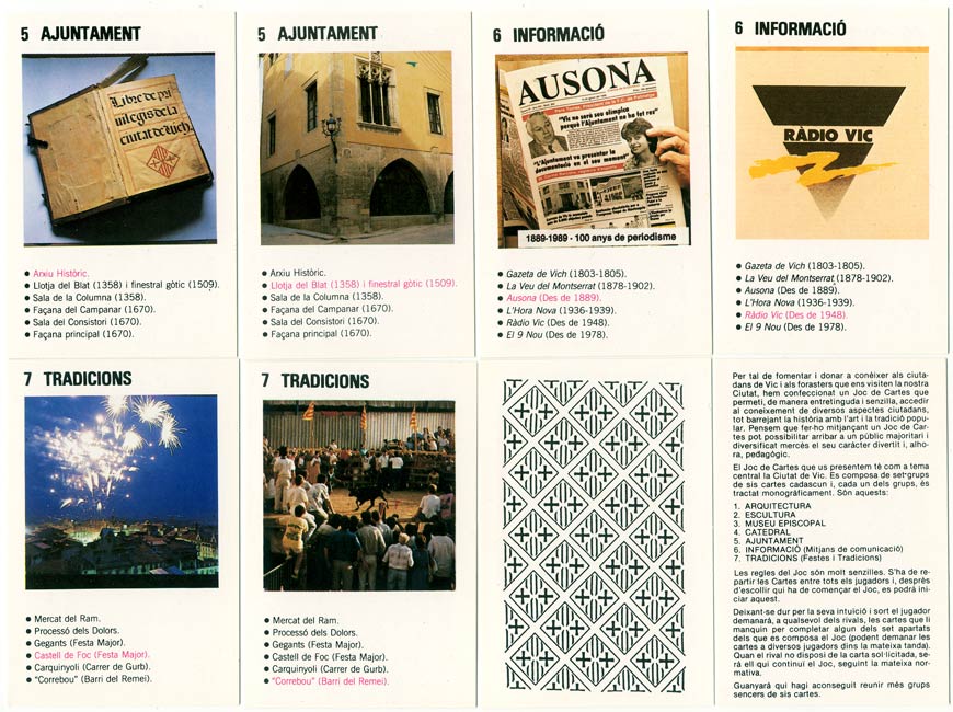 Vic Joc de Cartes is a happy families quartet game, printed and published in Vic, (Osona, North East Spain), c.1990. This game cleverly combines two purposes, 1. to promote the cultural attractions of the city of Vic, and 2. to serve as an entertaining card game for a wide age group. The publishers have expressed their wishes, on the extra card which accompanies the pack, to provide visitors to the city with an engaging souvenir which also teaches about Vic's wealth of historical, artistic and traditional heritage whilst providing an entertaining and educational game of cards.
