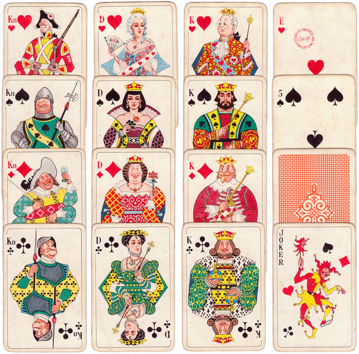 “Four Centuries” (4 Sekel) playing cards by Esselte Öbergs A.B. with the court cards depicted as colourful caricatures from different historical periods in each suit, wearing imaginative costumes, also following distinct colour codes. The indices are ‘Kn’ (Knekt) for the knaves, ‘D’ (Dam) for the queens, ‘K’ (Kung) for the kings and ‘E’ (Ess) for the aces.