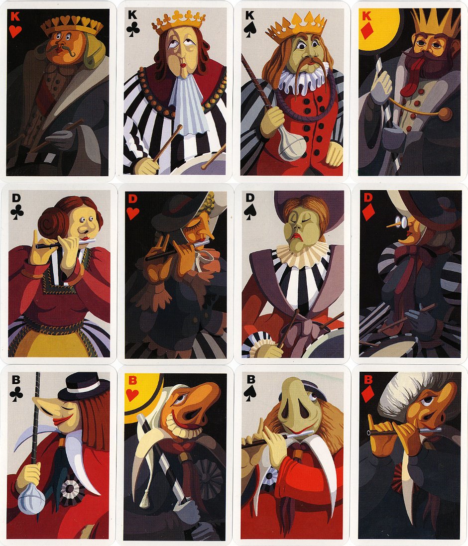 Above: the 12 court cards from the 1987 Basler Fasnachts-Karten deck designed by Marianne Pomeroy and printed by Müller A.G., Neuhausen a/R. 52 cards + 3 Jokers.