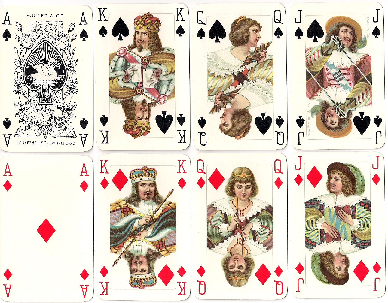 The double-ended fantasy courts cards depict characters from the French court in 17th century period costume. The special Müller Ace of Spades and Joker complete the set.