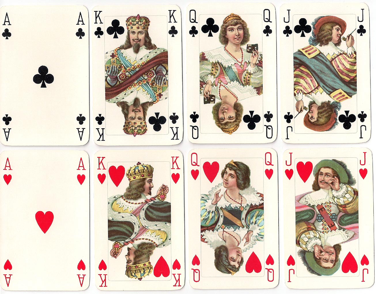 These cards are from neatly etched plates, and are carefully coloured. The court cards present full-...