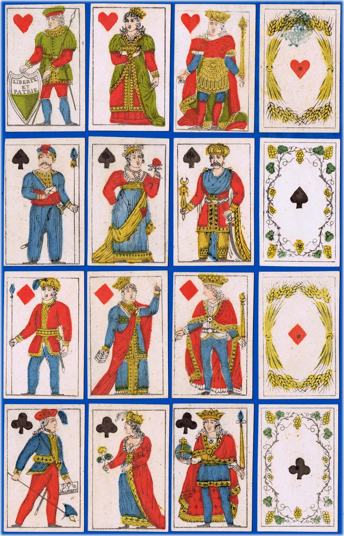 Full-figure French suited Piquet playing cards by David Vachet, Lausanne, Switzerland, c.1812. The jack of hearts shows the motto of the Vaud Canton "Liberté et Patrie" and the maker’s name appears on the jack of clubs.