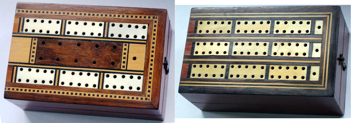 Above: two double box cribbage boards varying in quality from the highly polished veneered Victorian example and a more basic version from the same period. From the collection of Tony Hall.