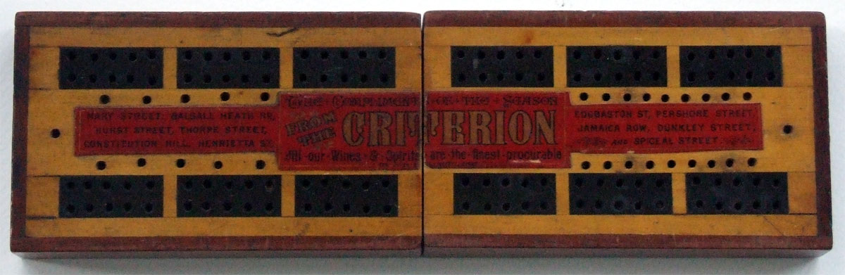 Above: rare example of single cribbage box with advertising, offering the Season’s Greetings from the Criterion chain of wine and spirit shops operating (judging by the street names) throughout the Birmingham area. The design suggests any time from 1900-1920. From the collection of Tony Hall.