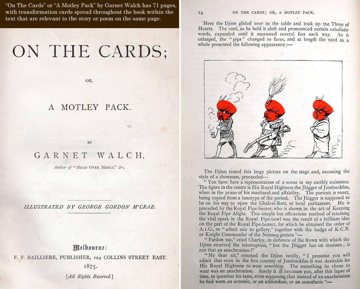 A book titled “On The Cards” or “A Motley Pack” by Garnet Walch (1843-1913) was published in Melbourne (Australia) and illustrated by George Gordon McCrae in 1875.