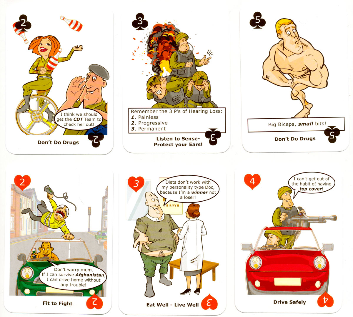 Health Promotion playing cards issued by the British Army with cartoons about army life and information on where to get health advice.