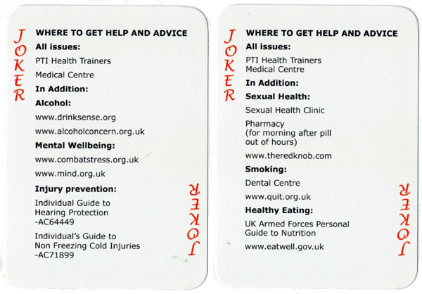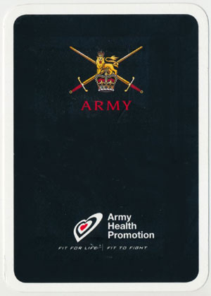 Above: Army Health Promotion playing cards issued by the British Army, 2011. 52 cards + 2 jokers + exra info card in box. The back has the British Army insignia (lion atop crown over crossed swords) with the text “Army Health Promotion” “Fit for Life ¦ Fit to Fight” printed below in white. Images courtesy Matt Probert.