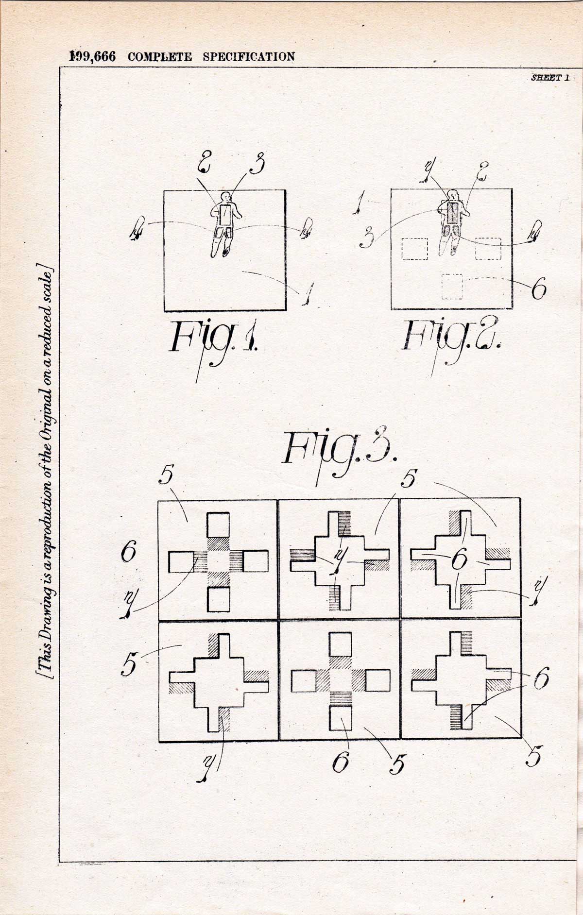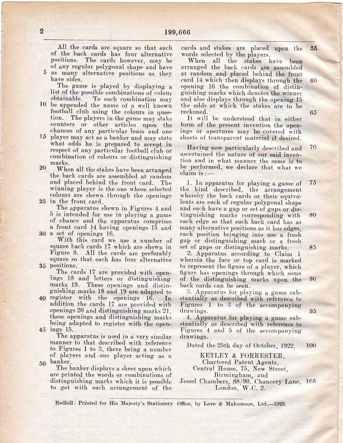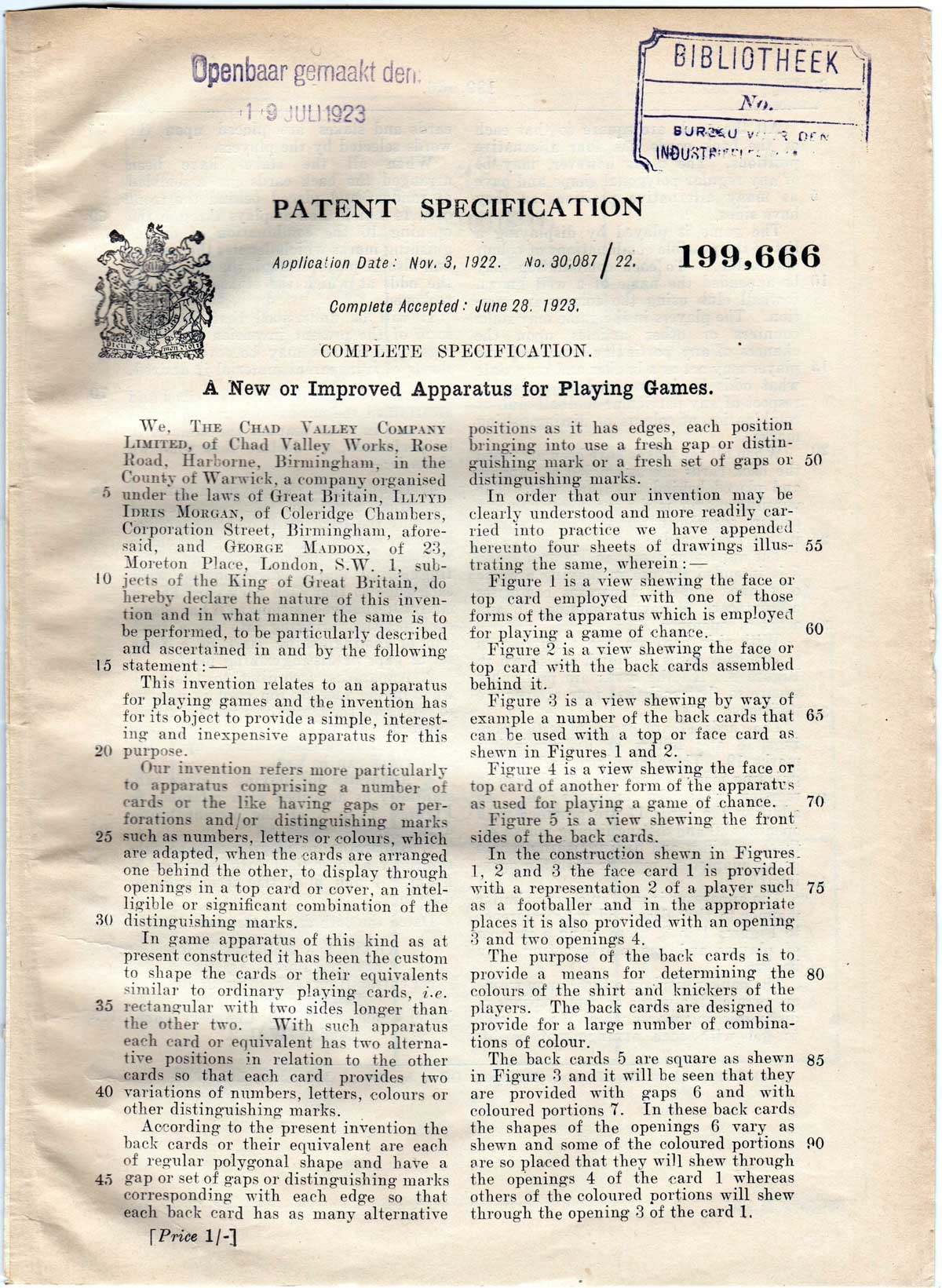 Uback horse racing game patent specification, Chad Valley Co Ltd, 1922. This patent was 1922 with the proper UK patent number. At this time the patent office decided that the way to stop people from copying and infringing copyright was to make the original patent details available to the public. This patent looks as though it might have been ordered by a Dutch company with the library stamp on it. But the number 199,666 looks like a US patent number (possibly overprinted).