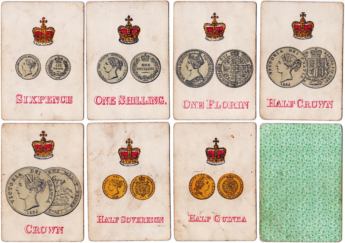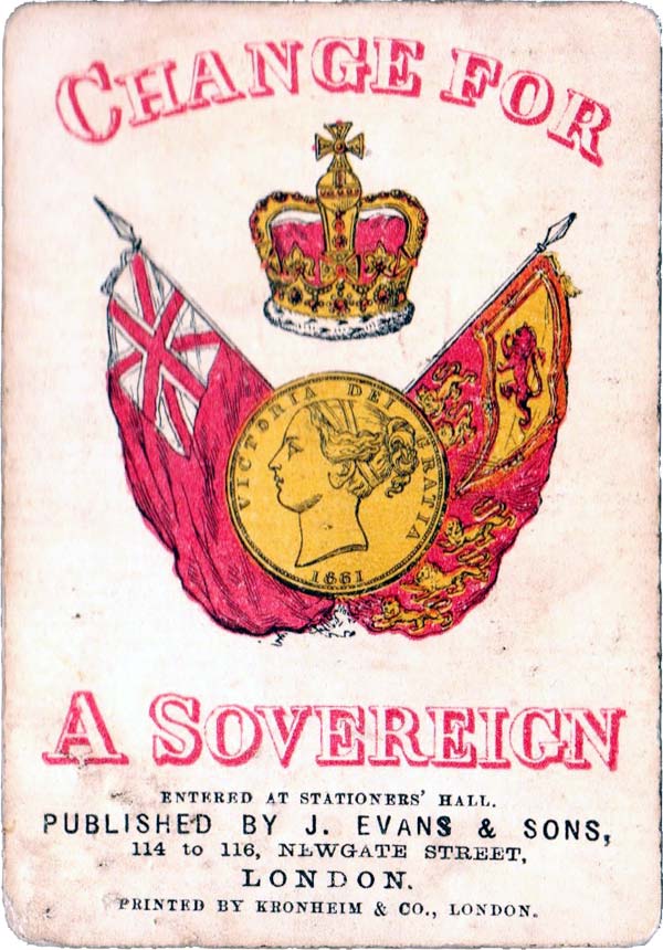 Change for a Sovereign - a card game published by J Evans & Sons, Newgate Street, London and printed by Kronheim & Co., London, designed to teach children about the value of money of the time.