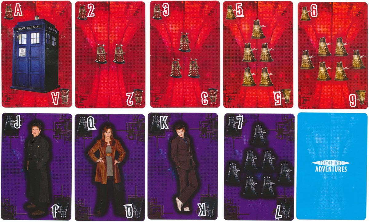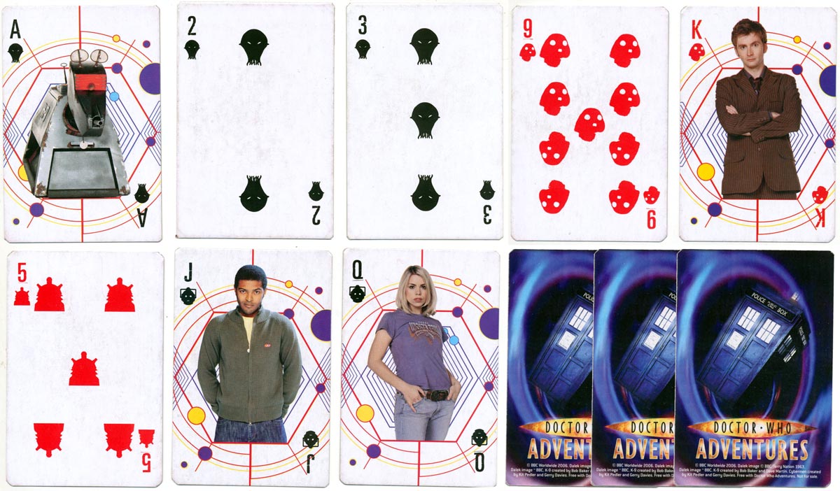 Above: in 2006 the children's magazine 'Dr Who Adventures' included a free deck of cards based upon characters from the BBC television sci-fi series 'Dr Who'. The suits have been replaced by characters from the series, Daleks, Cybermen, Slitheen and what looks like Ood. © BBC Worldwide 2006. Dalek image © BBC/Terry Nation 1963. Dalek image ™ BBC. K-9 created by Bob Baker and Dave Martin. Cybermen created by Kit Pedler and Gerry Davies.