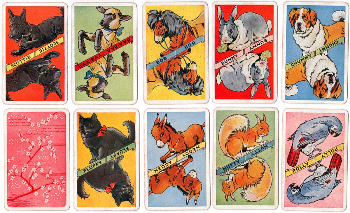 “Our Pets Snap” is one of a range of children's card games designed by A. E. Kennedy for Faulkner & Co., c.1930s. Albert Ernest Kennedy (1883–1963) was an Illustrator of children’s books mostly about animals. His charming illustrations are full of colour and personality. In this game the animals are double-ended.