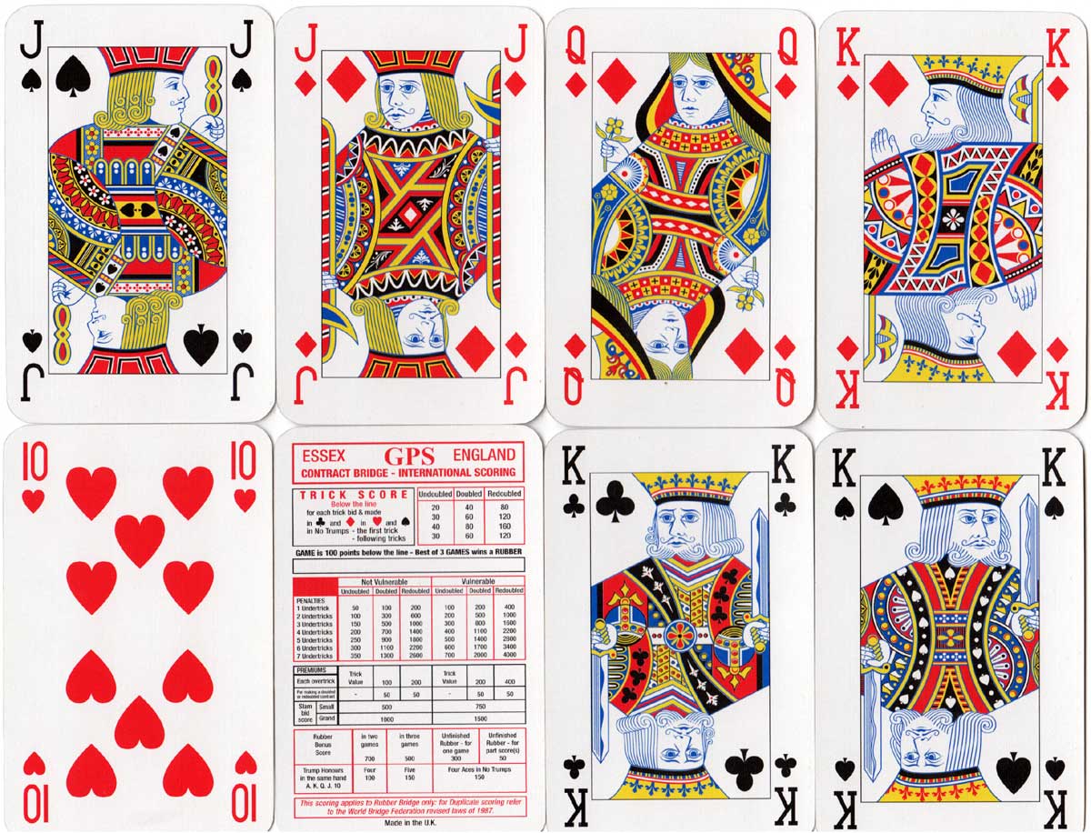 Games & Print Services introduced traditional English courts and a special typeface for the indices after c.1997. The jokers have been re-drawn and the Ace of Spades has a © symbol because of an attempted copyright infringement. The company is now part of Cartamundi.