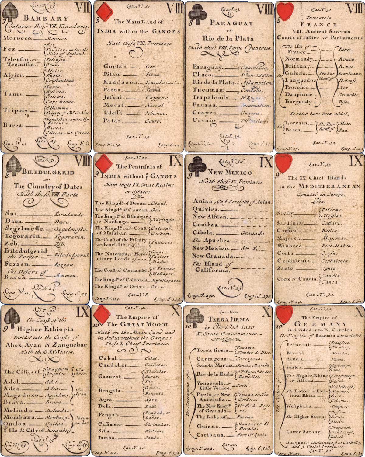 The greater portion of each card is occupied by a geographical account of various countries, including longitude and latitude, a systematic classification of which is given on the ace of each suit. The court cards have a central cartouche depicting kings, queens, ethnic groupings and dignitaries of the period. Hearts represents Europe, spades = Africa, diamonds = Asia and clubs = America. Similar sets were produced in France, Germany and Italy at around this date.
